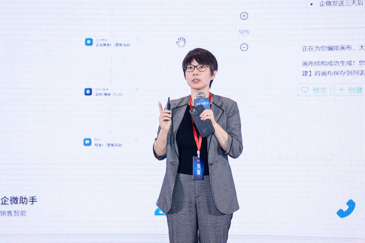 中欧国际工商学院市场营销学鲁薏教授以“人效”向“智效”的转型为核心,分享了智能体营销的学术洞察与企业实践。她认为,企业AI红利有三个阶段: